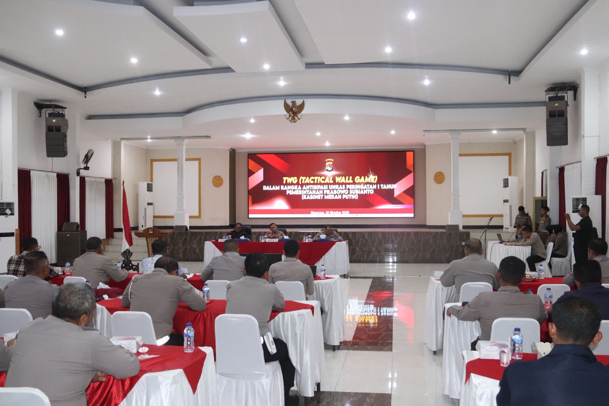 Mataram, NTB – Dalam rangka mempersiapkan pengamanan unjuk rasa menyambut satu tahun kepemimpinan Presiden Prabowo Subianto, Polda NTB menggelar Tactical Wall Game (TWG) di Gedung Sasana Dharma Polda NTB, Sabtu (18/10/2025).